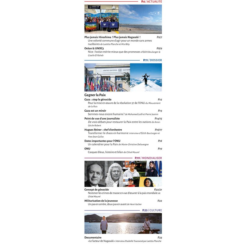 Dans ce numéro, le dossier "Gagner la paix" : stopper le génocide à Gaza, le point de vue d'une journaliste, une interview du chef d'orchestre Hugues Reiner, l'ONU et ses casques bleus...