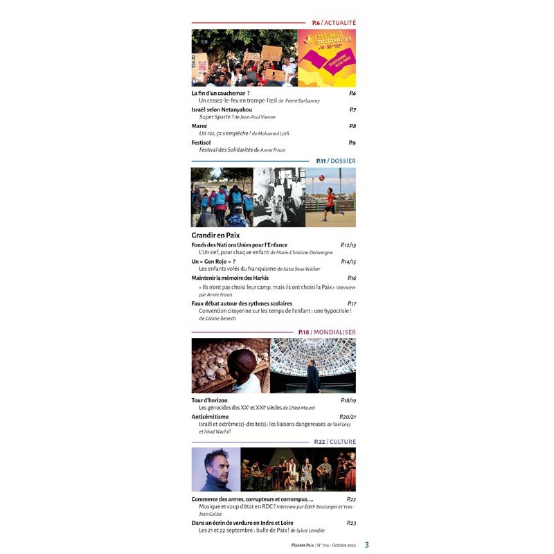 Dans ce numéro, le dossier "Grandir en paix" : le fonds des Nations Unies pour l'enfance, l'Unicef, les enfants volés du franquisme, la mémoire des Harkis, le faux débat autour des rythmes scolaires, les génocides des XX° et XXI° siècles, les liaisons dangereuses entre Israël et l'extrême droite...